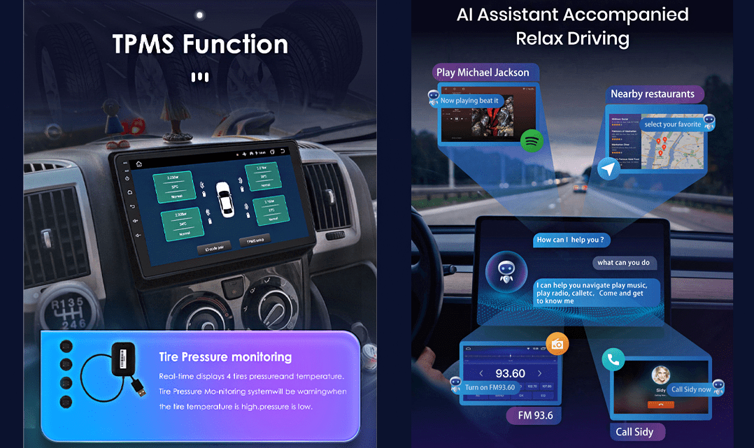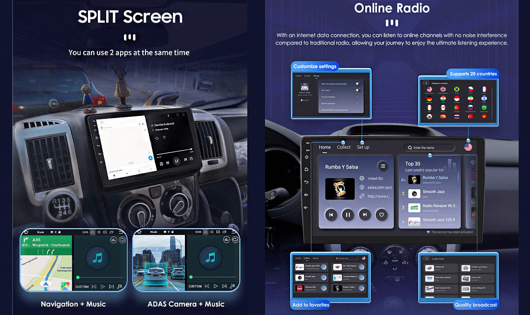 - Støtte for rattstyring (valgfri adapter), front- og ryggekamera, parkeringssensor, med mer.